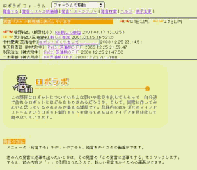 その憧れのロボットを子どもたち自身で設計し,自分で作ってみよう,というプロジェクトが「ロボラボ」である。この会議室には,芝浦工業大学柏中学校と神奈川大学附属中高等学校が参加した。そして,中学生,高校生がLEGO社の「マインドストーム」を使って,ネット上でアイデアを出し合いながら自分たちの理想とするロボットを考えて制作した。そして,それぞれの学校で制作したロボットをデジタルカメラで撮影した写真を添えて会議室に発表した。(図2,図3)