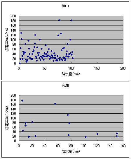 屋久島の場合、ECを見ると岳南中学校では20数回の測定値は全て30mS/cm以下であるのに対して、宮浦中学校16回の測定値のうち、30mS/cm以下は7回で、9回は30mS/cm以上で、100mS/cmを超える場合も3回あり、そのうち2回は降水量が50mm以上である。宮浦中学校の場合、学校に比較的隣接した汚染源が想定できる。