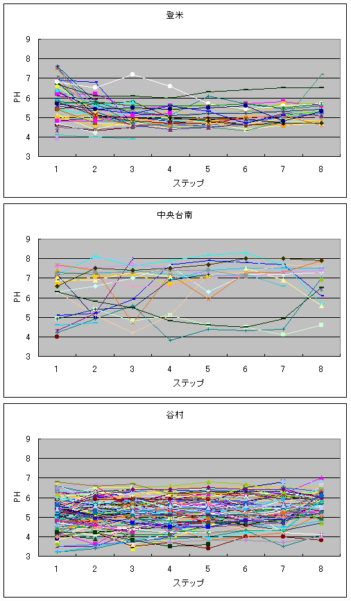 また、pHの変化はその地域、またその時期の汚染物質の酸性が強いか、弱いかでパターンが分かれていると思われる。どの場合も収束値はその時の降水自身のEC、pH値に近づいて行くと考えられる。