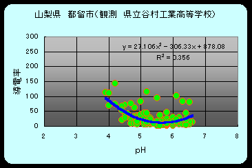 大和市では、pHの幅は3.0〜8.5と大きく、雨量が多くても導電率が高いものがあり、汚染状況はまだまだ、改善されていない。