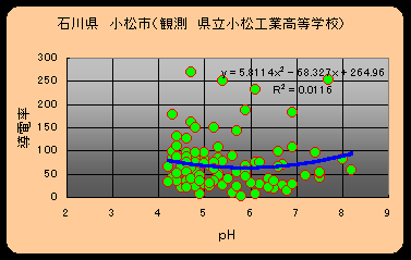 小松市では、pHの幅は4.2〜8.3と大きくい。雨量はレインゴ−ランドの貯水限界28mm以上が観測されていないが、導電率が高い降水が多いようである。