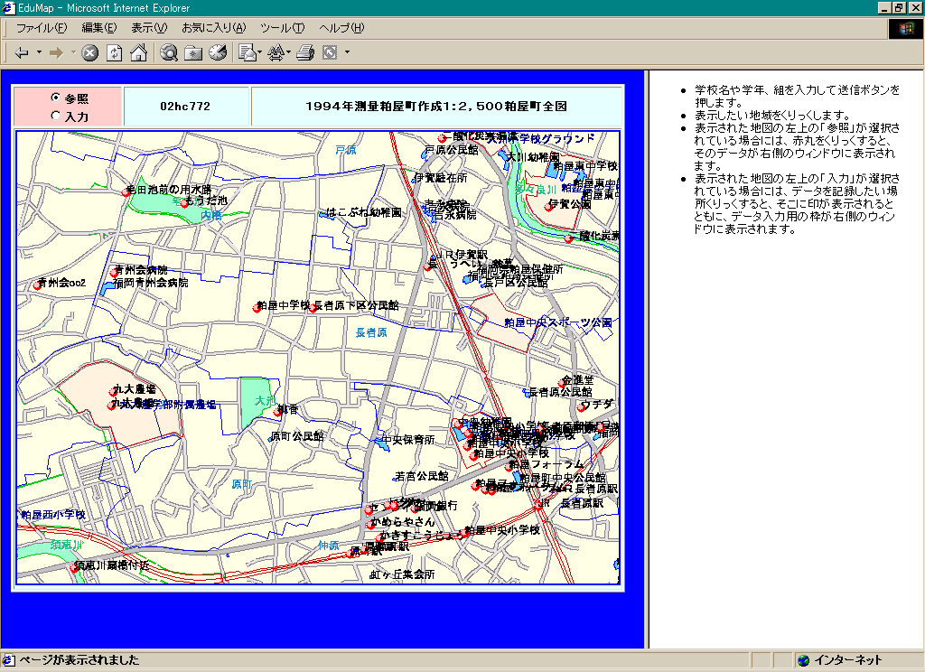 インターネット電子地図の利用は,WWWブラウザを利用して行う。WWWブラウザとしては,小中学校で標準的に利用されているInternet Explorerを利用する。なお,地図利用に関してInternet Explorerに固有の機能を部分的に使っているため,現時点では,Netscapeには対応していない。