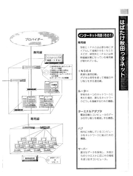 第三セクターであるIPAにサーバ等のセンター設備を設置し、各学校はIPAにダイアルアップ接続、教育研究所はIPAと専用線接続するというシステムを提案。IPAに対して、サーバ設置・管理・運営を委託する形である。平成9年から「はばたけ秋田っ子ネット」の整備が始まった。提案した時点では、IPAはプロバイダを開業していなかった。