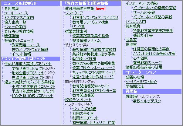 Eスクエアとは、教育のためのサイバースペース上の広場という意味をもっている。スクエアには、街の中心広場のように、教育に関係する全ての人が自由に出入りし、情報交換、議論、共同で利用等を行なうことにより、情報、ノウハウを拡充強化し、それを全国の小学校、中学校、高等学校等が利用できる。