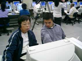 生徒や教師がコンピュータのスキルを意識したり,身構えることなく,クイズやスタンプラリーを通して,多くのディジタルコンテンツを閲覧したり,検索機能を使用したりすることができる研修パッケージを開発した。小学校低学年にはスタンプラリーを,小学校高学年以上には,クイズ形式の研修パッケージの利用を勧めた。クイズでは,コンテンツを見て解答するだけでなく,プレゼンテーションソフトやホームページ作成ソフトに回答コンテンツのサムネイルをコピー・アンド・ペーストし,テキスト入力も行う。回答用紙となるプレゼンテーションファイルは,予め各クライアントに配布した。回答作成時には,ディジタルコンテンツの検索機能を使い,答えとなるコンテンツを探すためにキーワード入力にも工夫がみられた。ディジタルコンテンツを検索し,クイズを解くことに集中しているため,多くの教師や生徒は,同時に二つのソフトを使用する困難さを感じることなく,楽しんで慣れ親しむことができた。 |