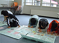 最後に班ごとに分かれ、自分たちが新聞記者となって新聞を作るためのそれぞれのテーマについて、制作物などをもとに材料を集めた。取材メモの作成の時、ワークシートを活用し、いちばん伝えたいこと、いちばん感動したことは何かを考えて、記事の構成を考えた。