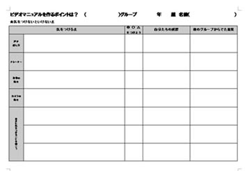 相手にポイントを効果的に伝えるために必要な視点を考えるためのシート。「声の大きさ」「ナレーター」「役者の動き」「その他」の項目でビデオマニュアル製作時の注意点など児童自らが考え記入するシート。 |