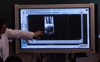 「炭酸塩の水溶液に塩酸を加えたときの化学変化を記録した映像を見せながらその反応について確認している様子です。WindowsME用のソフトではMediaPlayerの映像を静止画で取り込めないのが残念です。」