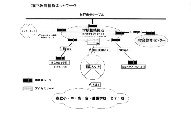 学校接続拠点は神戸市光ケーブルで神戸市のイントラネットに接続(intra.city.kobe.jp)。