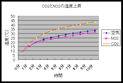 表3から、CO2は空気に比べて温度上昇が大きく、温室効果ガスと考えられるが、NO2は空気よりも温度上昇が少ない。しかし、これは、2NO2 → N2O4+59kJの平衡反応により、NO2が生成したと同時にできるN2O4がNO2にもどるときにまわりから熱を吸収するために温度が上昇しなかったのではないか考えられる。この実験だけではNO2が温室効果をもつかどうかははっきりしなかった。