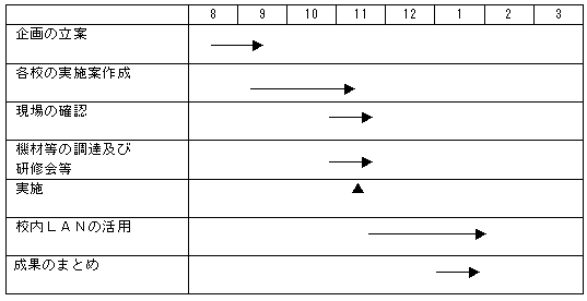 「校内LANワーキンググループ」の下で以下の3校において実施する。各学校は実施グループ組織し、学校の事情を勘案し、詳細を検討する。(実際の敷設作業は学校ボランティアのサポートを募ることにより実施する。)