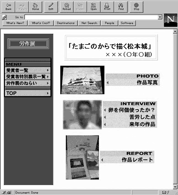 ・内容 「労作展のねらい」,「作品の紹介」,「教師による総評」のページ,感想を入れてもらうための掲示板からなる(図1参照)。