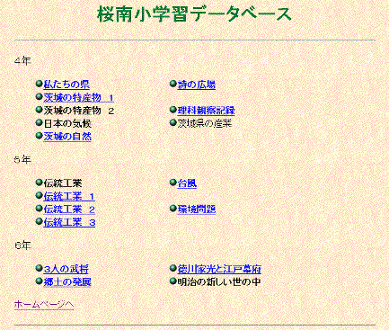 学校での児童の生活の様子などとともに,インターネットを利用した情報収集・情報交換を取り入れた学習の成果を,教科・単元ごとに「学習データベース」としてまとめ,ホームページ上に公開した。
