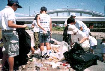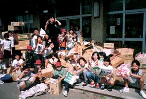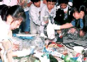 このような実態がわかったところで,世界の仲間たちと相談して(ミクロネシアとは,衛星を使ってリアルタイムの意見交換を行った),身近なところで自分たちにできることをと,ゴミ拾いボランティアやリサイクル活動をいっしょに行うことになった。当初は,「世界共通リサイクルデー」として,共通のリサイクルデー1日を特定の日に設定しようとしたが,学期の区切りや休日・長期休業など各国の学校事情等で1日に限定することが難しいことがわかった。そこで,「世界共通リサイクル週間」を設定して,世界の仲間たちと共に活動した。)