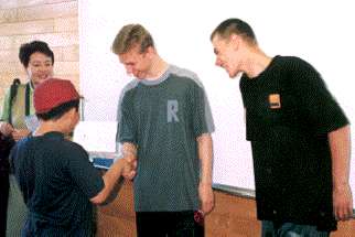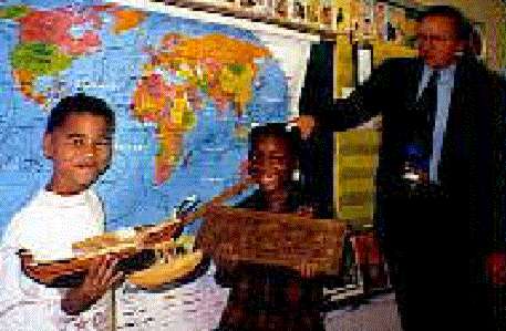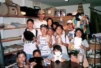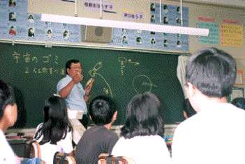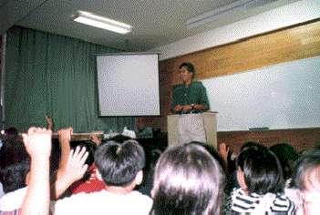 今年は,インターネットを通して交流した方,インターネットで知り合った方が紹介してくださった方などに,子どもたちが直接会って,環境問題や大自然,リサイクルのあり方について学ぶことができた。その一例が,下の写真のような,文部省宇宙科学研究所のロケット博士・的川教授(宇宙のゴミ,生命・地球の大切さ,国境を越えて地球を守る大切さを,マーズ・パス・ファインダーの火星着陸をNASAから報告し帰国した直後に来校),アメリカ大陸を歩いて横断した関口さんご夫妻(帰国後来校し,大冒険とアメリカの大自然について話してくれた),チェルノブイリで被曝したベラルーシの子どもたち(環境破壊で命を失うことさえあること,悲劇に負けずに明るくたくましく生きることのすばらしさ,ベラルーシ・ロシアの環境破壊・リサイクル事情を教えてくれた),Earth Shopのニールさん(リサイクルと再生品を使うことの大切さ,再生品のすばらしさを教えてくれた)