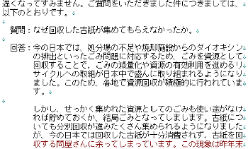 子どもたちが,がんばって集めた古紙を回収業者の方に渡そうとしたところ,これまでお世話になっていた方は廃業し,他の業者でも回収を断られたり,有料回収になると言われたりして,困り果てると同時に強い問題意識を感じて,その原因を探り,何とか解決したいと活動を始めた。その際,ネットワークを通して協力を呼びかけたところ,わずか2日間で,全国の消費者,消費者団体,行政,回収業者,製造業者,環境関係のシンクタンクなど,実にさまざまな立場の方々が,30通以上のメールを寄せてくれた。親切に寄せられた情報,励ましの言葉に,子どもたちは,ネットワーク上の人々の温かさに感激し,真剣に原因の関連を突き詰め,これまでのリサイクルに出すだけの「集めるリサイクル」から再生品を積極的に使っていく「使うリサイクル」への発想転換が必要なことに気づいていった。このときに出会った人々との交流は今も続き,さらに広がってきている。(上は,全国から寄せられたメールの一例)