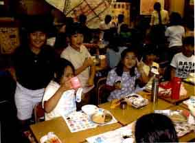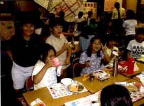 秋の遠足は横浜方面を計画した。この機会を利用し,本町小学校とのオフラインミーティングを計画した。帰りの時間の都合もあり,ほんのわずかの間ではあったが一緒に昼食をとりながらの交流を持った。最初は少々ぎこちなかったが,テレビ会議を通して話をしたという気安さからか,すぐうちとけて楽しそうに会話していた。(遠足で横浜市立本町小学校を訪問 図8 )