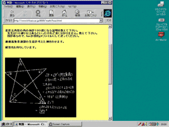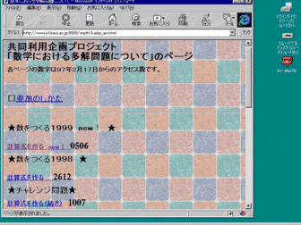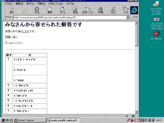 数学の問題として1999を使って数を作る問題などを考え,クラスごとにまとめ,インターネット上に解を登録する。ブラウザー(インターネットエクスプローラー)の使い方,サーチエンジンの使い方を習熟させ,インターネットでの数学の利用を考え,情報倫理についての話もおこなう。