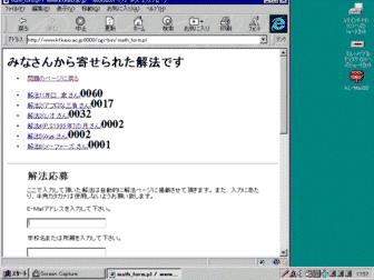 今回は復習を兼ねて冬休みの課題として各自に考えてきてもらったものをまとめる授業を行った。「インターネットでメールは送ったことがあったけれども,数学に使ったのは初めてです。使い方がわかってとても良かった。家でもやってみたい。」「普段の授業は,先生が,生徒を教えるという一方通行的な感じだったが,これは生徒自身が考えることなので楽しさが増す。数学は生きていく上でかなり重要だと思っている。それは,人類が進歩したのは科学つまり数学的思考によるものである。今後,あらゆる分野において数学を使うものと思うので,これからもがんばって身に付けていきたい。」「多解問題は取り組むと当然,解がたくさんあるので,今まで一つの方向からしか見ることのできなかったものが,いろいろな方向から見ることができるようになり,柔軟な発想を生み出せるので良いと思う。数学がただ知識を詰め込むだけのものなら,特定の職業に就かない限り大切ではないと思えるが,実際は数学を学ぶことによって柔軟な発想が身に付くのだから,どんな職業についても,未来で何があっても数学は大切であると思う。」など,なぜ数学を勉強するかということでの感想がかなりあった。また,生徒は自分の考えをインターネット上に公開するということにも喜びを感じていた。ネットサーフィンをするときにもいえることであるが,WEBをただ見て授業時間が終わりにならないように教員側がうまく発問したり,ワークシートを作ったり,生徒同士で話し合わせたり,発表させたりすることが必要である。普段の授業以上にインターネット利用では,WEB上に公開されている教材の質と利用の仕方に工夫が必要である。今回は学校での一斉利用であるが,この取り組みは生徒が自宅にいても,同じように可能であるので,インターネットで地域,時間,学校を越えて学習ができるようになる。インターネットでの共同学習が盛んになることを期待している。