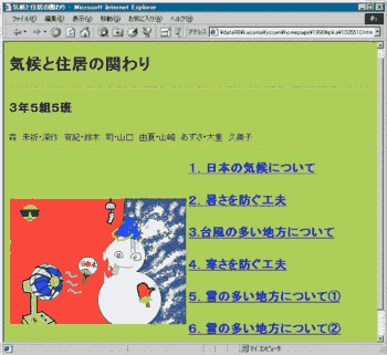 授業においてホームページを作成する場合,そのテーマの設定が問題となる。「住居」領域の学習成果をそのままホームページにすることにより,目的意識を明確にして情報を集めたり,グラフィックをかいたり,文章を整理してホームページを作成することができた。また,そのホームページをグループ発表に使用することにより,生徒のプレゼンテーション能力を高めることもできた。 |
