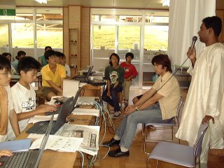 また、自律型広域学習環境の活動の一つ、留学生とのメイリングリストに参加している留学生の中でバングラデシュ、台湾、タイ出身の3名がこの合宿に参加し、交流会をおこない、各国の事情や言語、スポーツ、ビザ取得の苦労などについて話を聞いたり、一緒にインターネットに関する講座を受講したりしました。