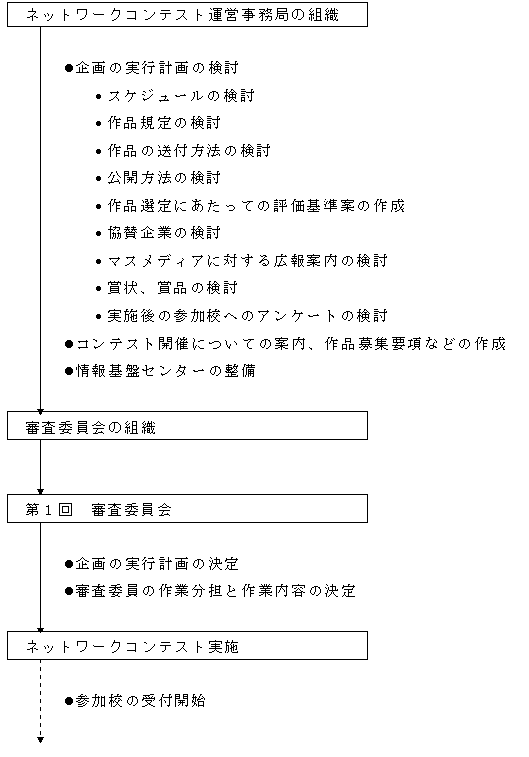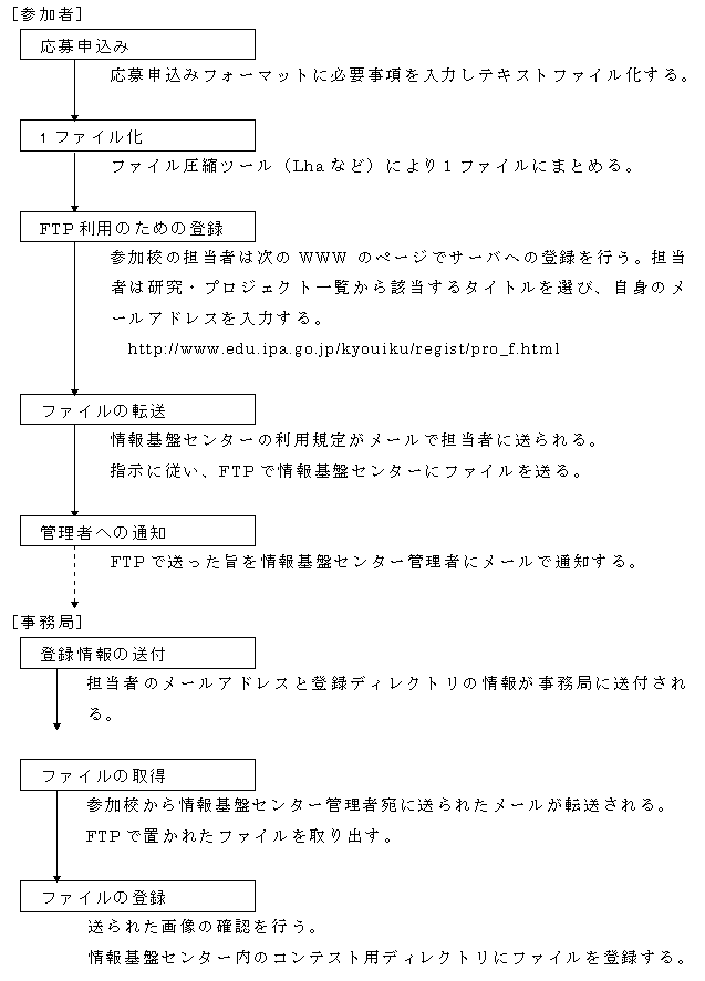 作品の応募ではFTPと電子メールを利用した。応募の詳細は参加校宛にメールを出すとともに、WWWにコンテスト参加校ページを作り掲載した。