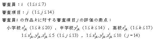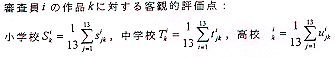 2.各審査員の総合評価点を得るために13項目に対する素点を小・中・高ごとに平均50,標準偏差10に規格化する.また,同様に13項目とは独立に主観評価1項目についても規格化する.これを規格化得点とする.
