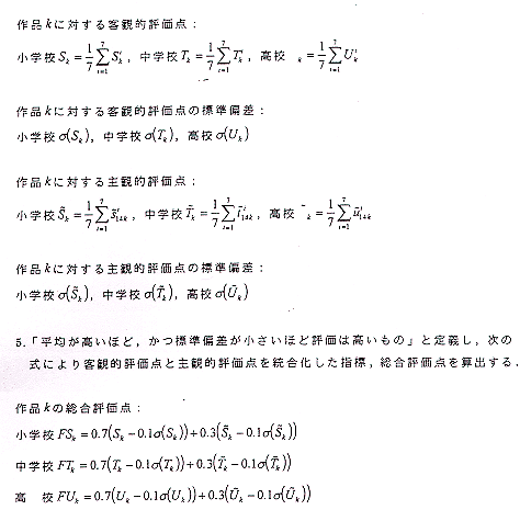 小学校・中学校・高等学校の各部門ごとに,「最優秀賞1作品,優秀賞3作品,入賞6作品」を総合評価点FSk,FSk,FUkの大きい順に決定した.また,「特別賞3点」はFSk,FSk,FUkの値とは関係なく「作者のコメント」にインパクトのある作品に決定した.FSk,FSk,FUkの最高点,最低点,平均点を以下に記す.