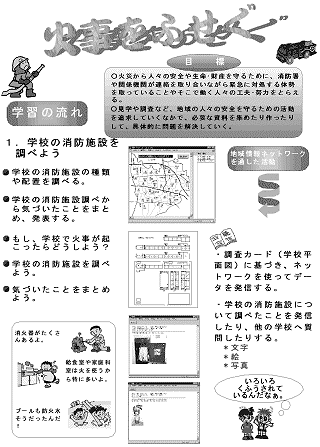 「火事をふせぐ」の学習は、市内の数校で校区内の消防施設を調べる共同学習である。校区の白地図に消防施設の位置をプロットし、お互いの校区を比較しながら情報交換を行ったり、消防署に対する質問をメールで送って回答を得ながら学習を進めた。